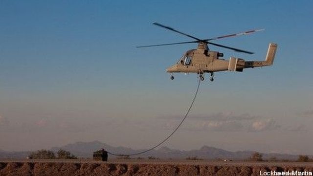 The K- MAX is a slim, stubby single-piloted helicopter that has been used commercially for years, often in lumbering operations in mountainous terrain. The K-MAX carries its cargo by slings and can deliver three loads to different locations in one trip, either autonomously or by remote guidance. During the deployment, two aircraft and the ground control station will be operated by a detachment from Marine Unmanned Aerial Vehicle Squadron One, supported by Lockheed technicians.
