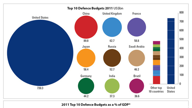 The International Institute for Strategic Studies (IISS) has released its annual series of reports on international defense spending, The Military Balance 2012. The full text is subscriber-only, but a summary press release, detailed table of contents, and a very useful overview of one of the more interesting volumes, “Comparative Defence Statistics,” are free online. The content of the comparative volume is important; it gives a view of the gigantic girth of the American defense budget.