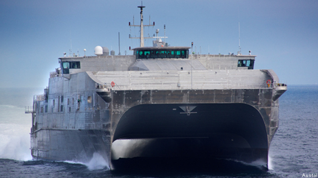 Derived from an Australian-built commercial ferry that the US leased to experiment with, the twin-hulled JHSV is a smaller, cheaper, unarmed sibling of the triple-hulled General Dynamics Littoral Combat Ship design, also built in the Austal yards in Mobile, Ala.; Austal is an Australian company. (There is also a very different LCS variant built by Lockheed Martin and Marinette Marine in Wisconsin). The unusual catamaran-like design of both ships is intended to reduce drag by giving them the narrowest possible cross-section in the water, yet without reducing stability.