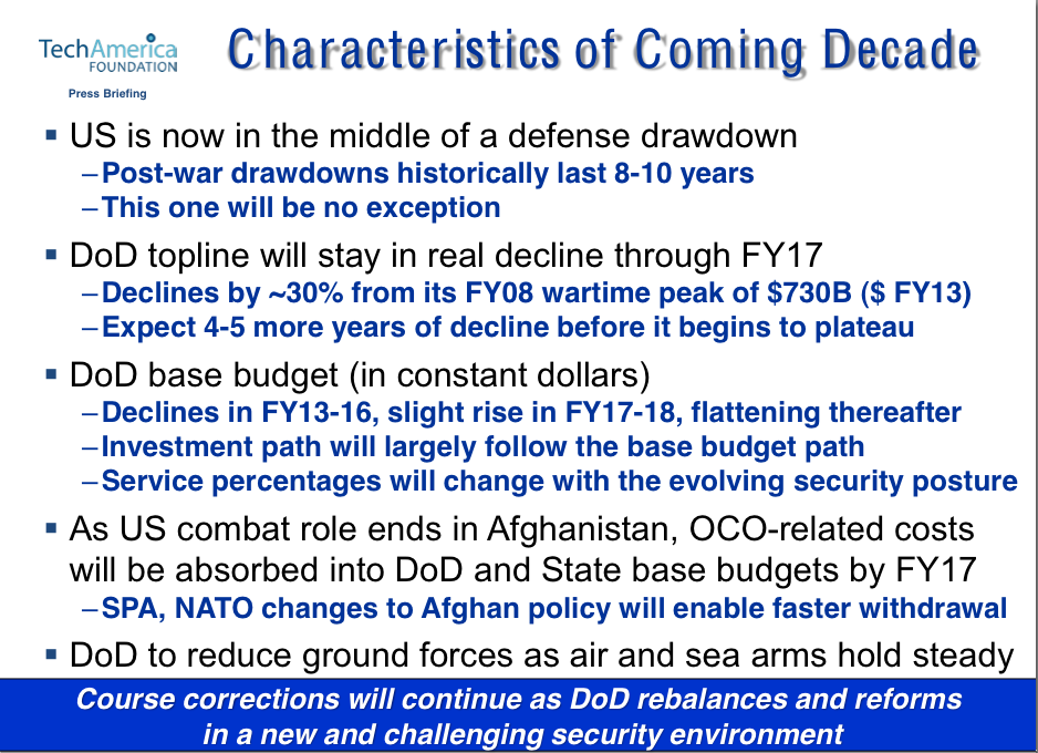 The Pentagon is already in the middle of a drawdown, which will probably last well into the next decade, according to the TechAmerica Foundation‘s study. Most post-war military drawdowns typically last eight to 10 years and this one will be no exception, TechAmerica analyst Trey Hodgkins said.