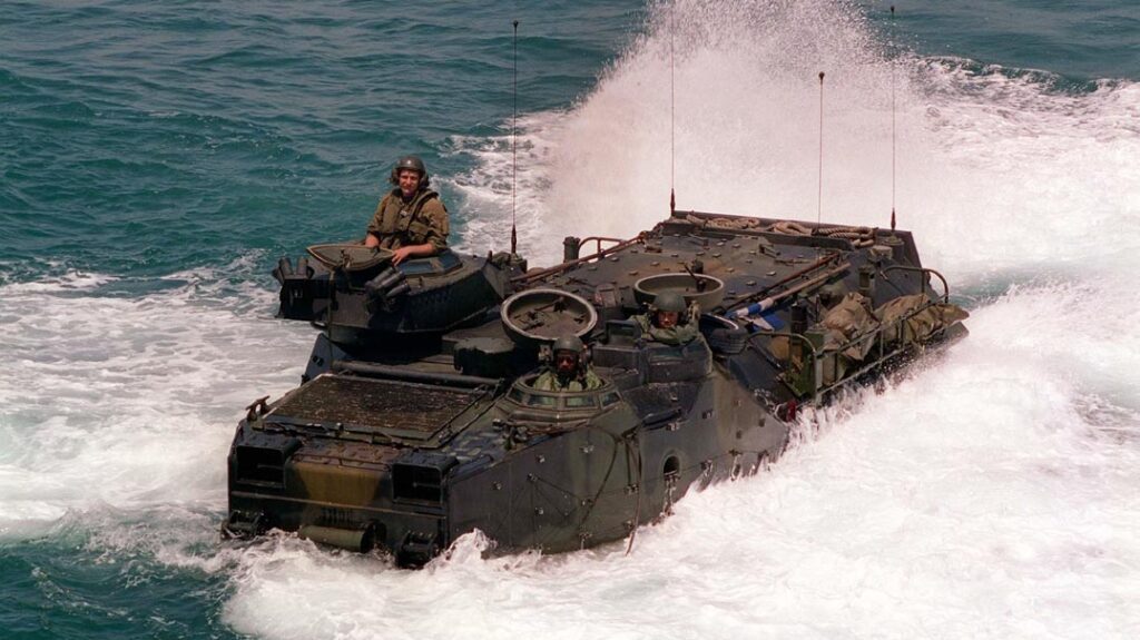 The Amphibious Combat Vehicle is meant to replace the aging and vulnerable Amphibious Assault Vehicle, aka the LVPT-7, which entered service in 1971, ceased production in the early 1980s, and fought with mixed success in Iraq. The AAV, in turn, is the successor of the famous World War II Amtrac, which revolutionized the military role of the Marine Corps. In layman’s terms, these are swimming tanks that carry Marine Corps foot troops — 24 in the AAV — over water, onto the beach, and deep inland.