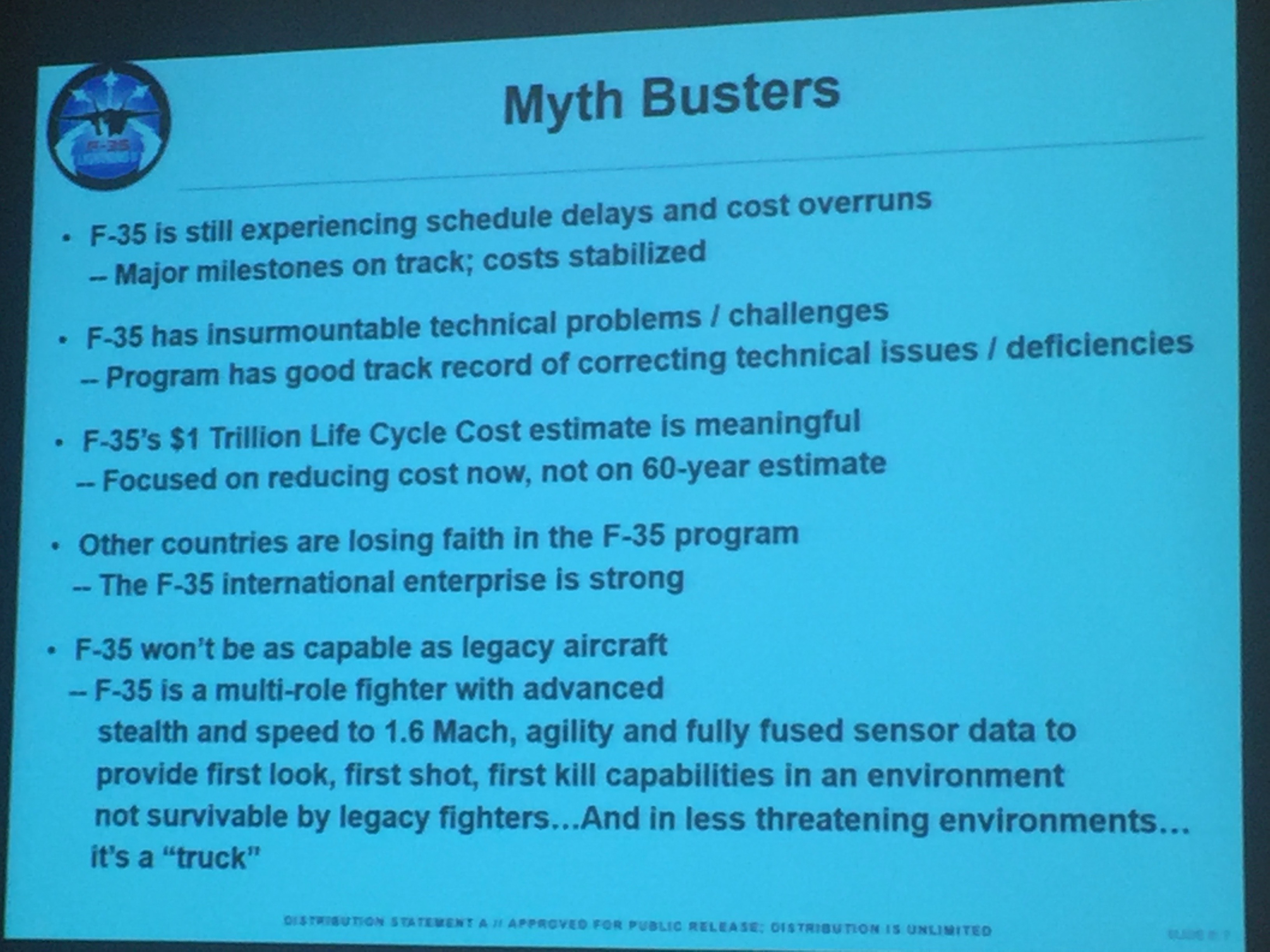 In his speech Bogdan also noted what is often a comically wide gulf between truth and the public depiction of the F-35 program. He offered these two tight summary slides to illustrate his point. The first item is his summary of what Wonderland believes. The second, marked by a dash, is what Bogdan says is the truth.