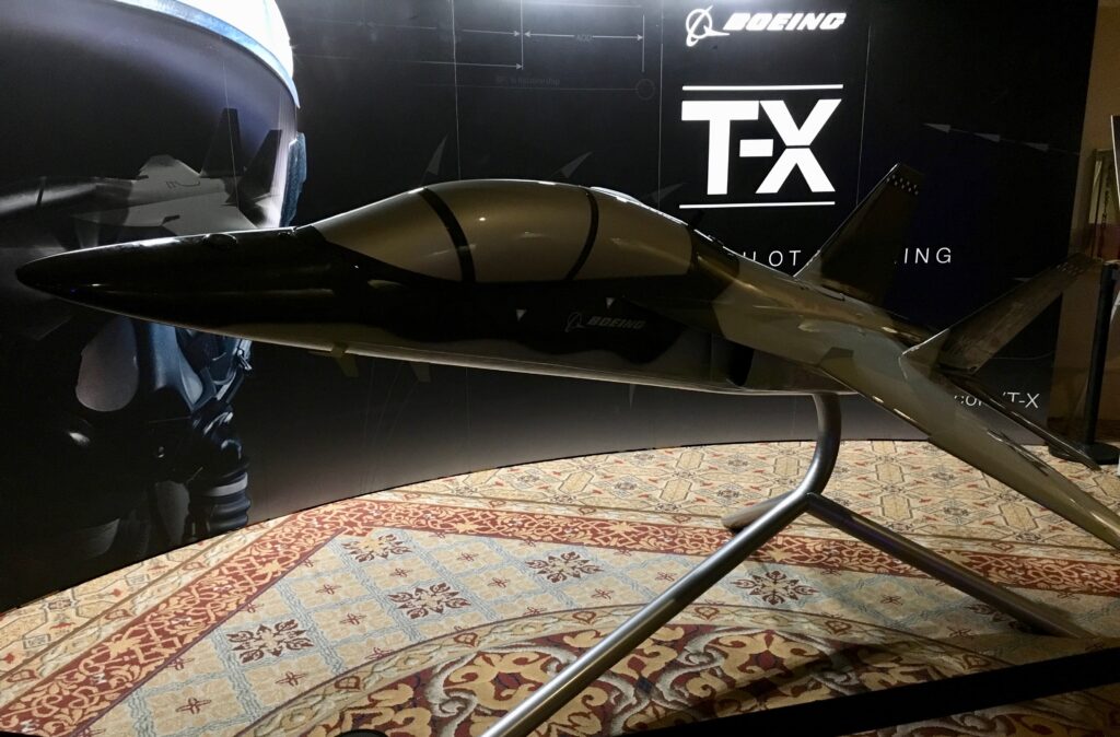 The exhibit floor here boasts scale models of a wide array of America’s highest tech weaponry. Just outside the main hall, for example, is a large scale model of Boeing and SAAB’s offering for the Air Force’s T-X trainer competition.