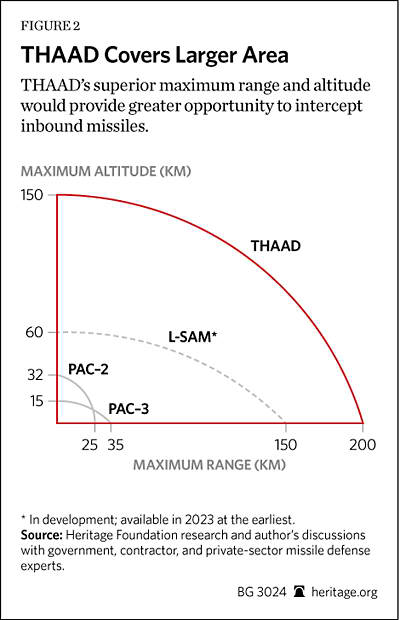 What would it take to stop an all-out Chinese salvo? Two more Patriot batteries, two more Aegis ships, and — most crucial — five THAAD batteries. The Amy’s Terminal High-Altitude Air Defense system can shoot down targets that fly too high for Patriot to touch, and it also has longer range.