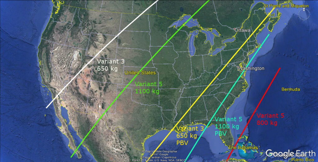 Figure 6 shows the maximum range of Variant 3, with a payload of 650 kg, and Variant 5 with 800 kg and 1,100 kg payloads, with Earth rotation included. With a payload of 800 kg, Variant 5 has sufficient range to reach Miami without applying PBV fuel to extend range.