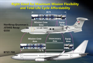 First, there is the platform competition. Here the Air Force faces a choice between better mission capability and the potential for future system growth. Boeing is offering a derivative of its 737 commercial airliner. The two other competitors, Lockheed Martin, and Northrop Grumman, are offering smaller business jets. The smaller aircraft offer a wide range of performance advantages: operating from more airfields (shorter runway requirements), taking up less ramp space and flying higher. Increased altitude equates to better “look angles” for the radar, thus adding a capability to see more ground targets with greater precision.