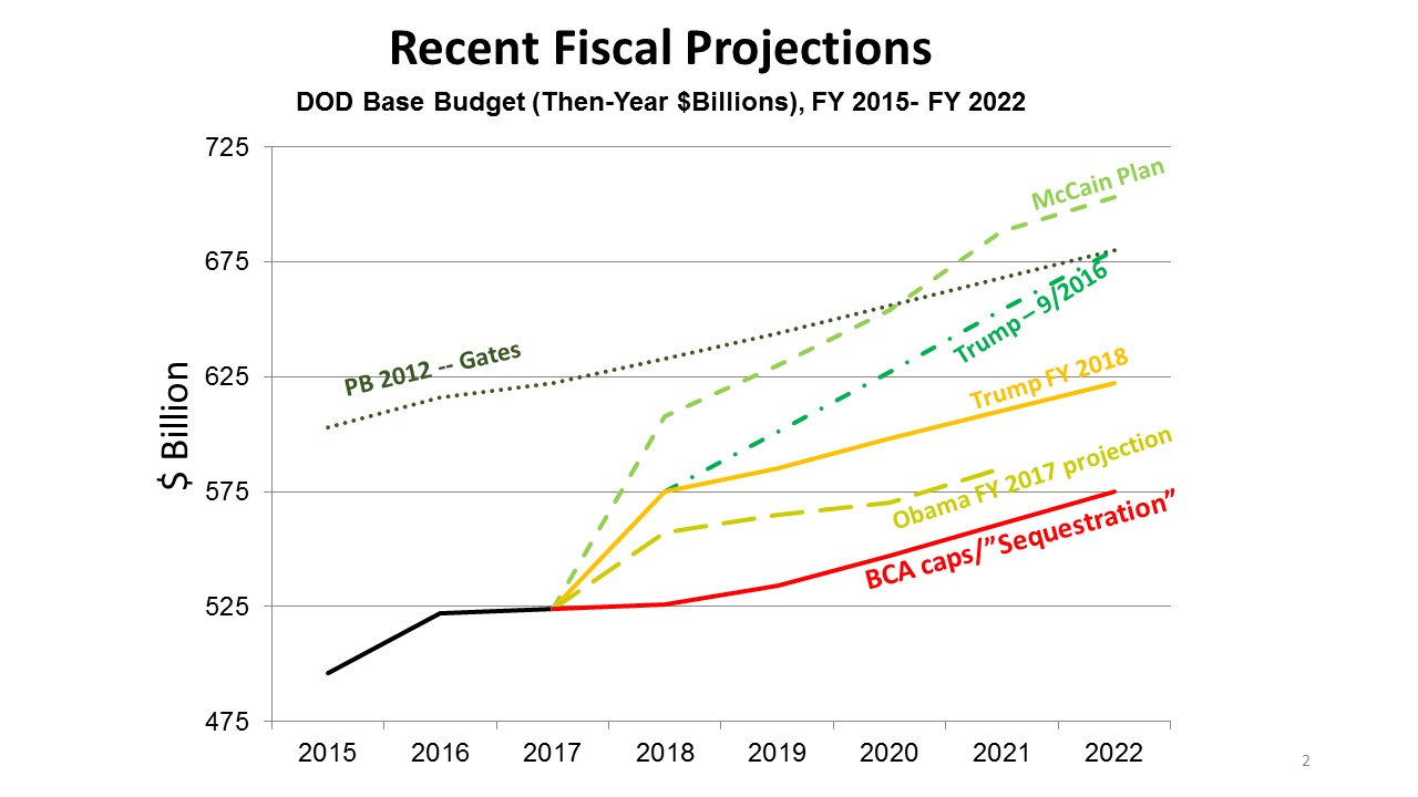 “Trump +$18B” is the Trump administration’s projection in the fiscal 2018 budget, an $18 billion increase over what the Obama administration had projected. (This was described as a $54 billion increase, but that used the Budget Control Act level as a baseline.) The Defense Department was emphatic that this projection was a “non-policy” profile that would be changed as a result of the administration’s strategic reviews. In theory it could go higher. However, it represents budget “facts on the ground”, and the department must appeal to OMB for more resources. (Note: Cancian used to be the OMB person who said no to the Pentagon.)