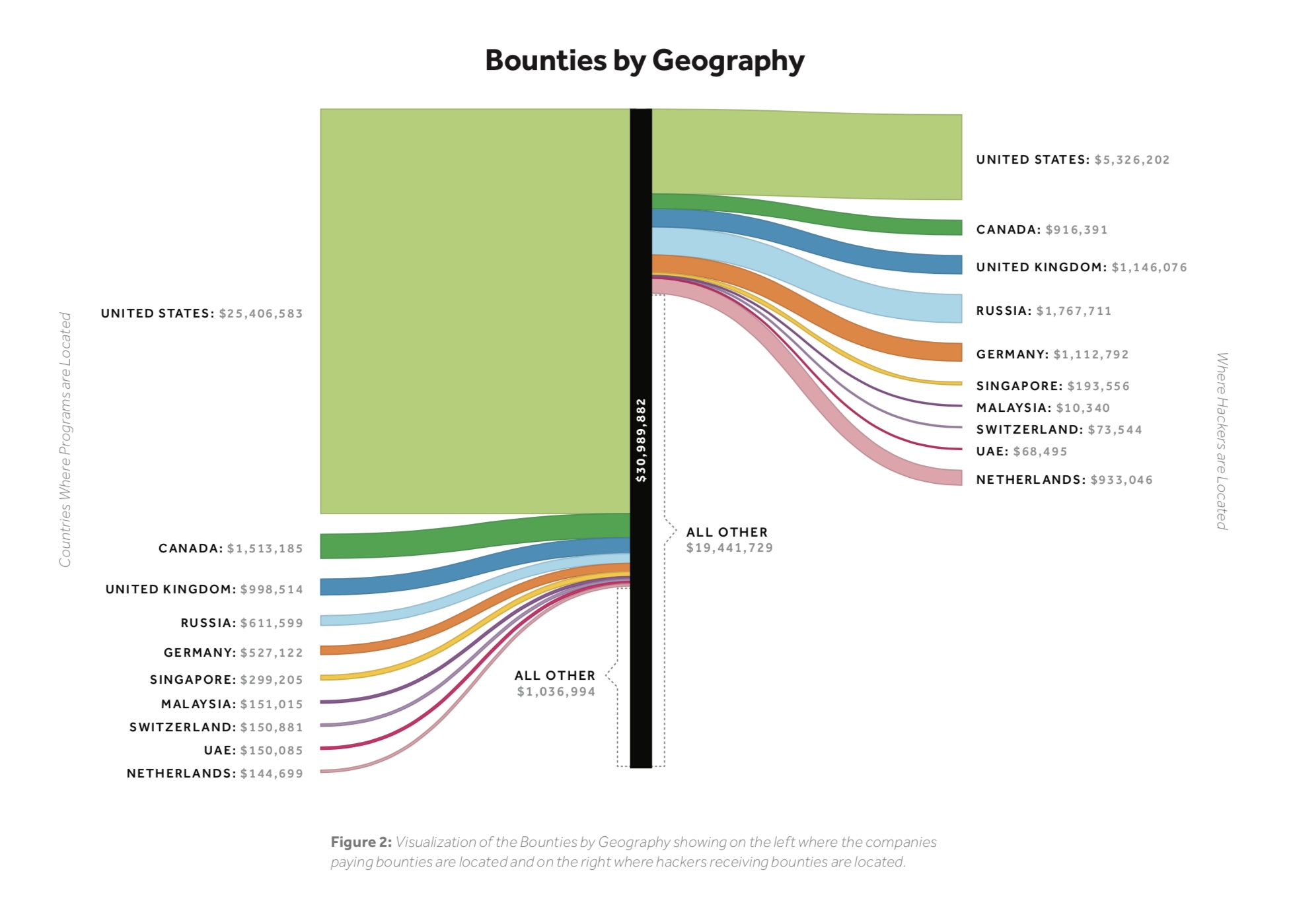 “The fact is this the most cost effective way of finding vulnerabilities and the money you pay out is nothing compared to the value you get back,” he said. That’s why, he argues, it’s not a problem that HackerOne’s US clients have paid out 81 percent of bounties to date but 83 percent of the money has flowed to non-US hackers. (See chart below). The company’s business model is firmly internationalist and committed to open-source approaches, with Micklos arguing secrecy easily becomes counterproductive.