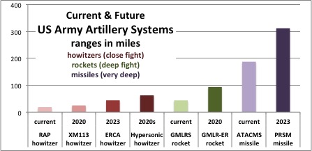 - Tactical fires, i.e. howitzers, which the Army plans to upgrade to Extended Range Cannon Artillery (ERCA) with a 44-mile or even 63-mile range by using a longer barrel and improved, possibly hypersonic Rocket-Assisted Projectiles (RAP).
