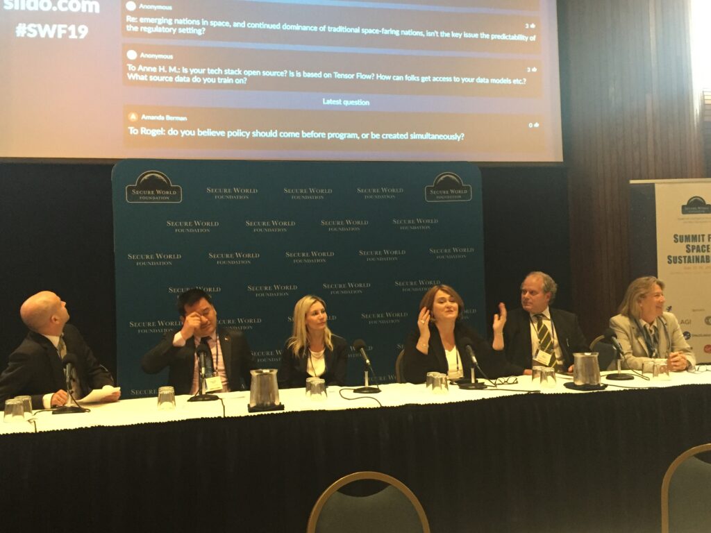 At the same time, there is an increasing interest on the part of the space industry in norm setting — including regulating certain military activities such as the use of debris-creating anti-satellite (ASAT) weapons. The SWF meeting today was co-sponsored by Analytical Graphics Inc. (AGI), Virgin Orbit, OneWeb, SpaceLogistics (formerly Orbital ATK and now a subsidiary of Northrop Grumman) and Japanese start-up Astroscale, Further, major satellite firms Lockheed Martin and Airbus are supporting an effort led by the World Economic Forum to create a ‘Space Sustainability Rating’ to promote industry compliance with international and national best-practice guidelines.
