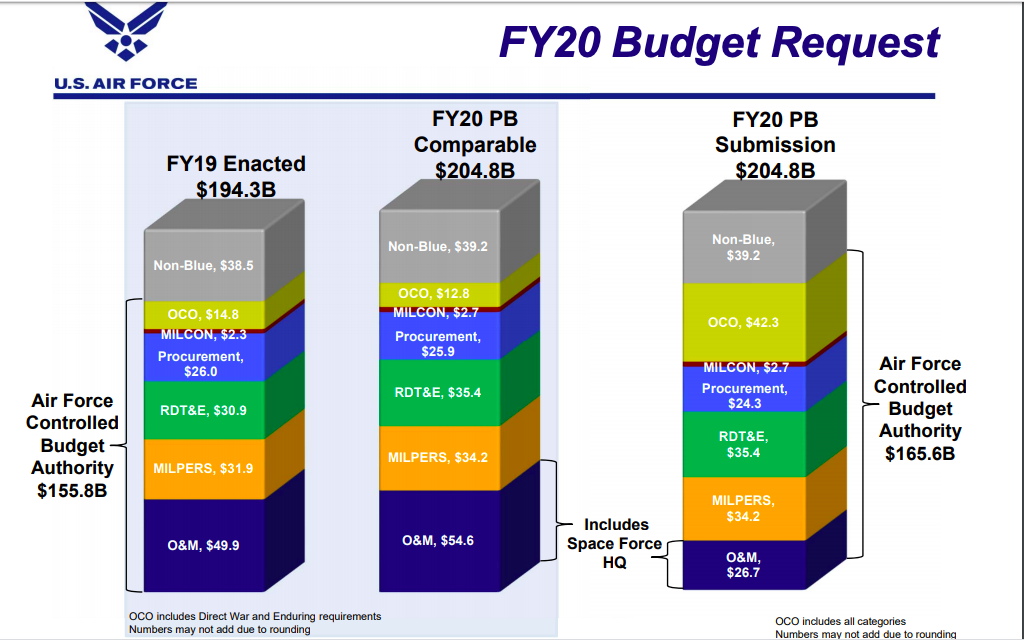 And, indeed, Deptula’s numbers reflect those in the Air Force’s 2020 budget documentation, in which the service refers to “pass through” funds as “non-blue” money.