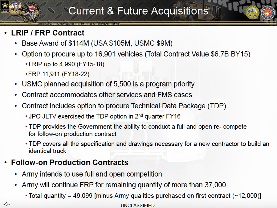 “TDP covers all the specification and drawings necessary for a new contractor to build an identical truck,” one slide says. “TDP provides the Government the ability to conduct a full and open re-compete for follow-on production contract.”