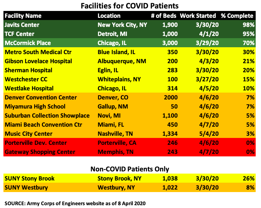 As of today, 17 projects are in various stages of construction, providing a total of 14,630 beds. Some 12,570 of those beds will be able to handle COVID-19 cases, since those require oxygen, negative pressure containment and other special measures. That’s a much higher percentage of COVID-rated beds than the Corps had planned. The original idea was to take non-COVID patients out of the existing hospitals and let them focus on the pandemic, but that proved impractical because one infected patient at a non-COVID-capable facility might shut it down.