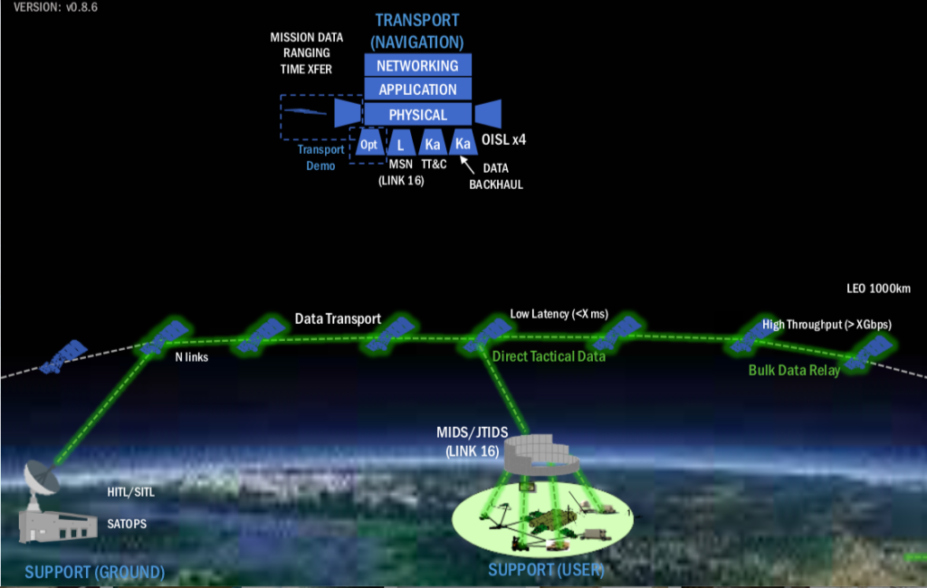 SDA issued its first draft Request for Proposal (RFP), focused on the data transport layer in late March. The RFP describes a Low Earth Orbit (LEO) satellite constellation designed to allow low-latency communications (that is, with little lag time between the sender and the receiver). It will use optical cross-links between satellites, and link to users on the ground via the venerable Link 16 system used widely by the services and allies, and the Integrated Broadcast System (IBS) that carries Ultra-High Frequency (UHF) communications and is compatible with systems used by the Intelligence Community.