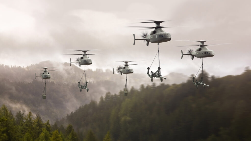 Defiant-X compound helicopters sling-loading heavy cargo (artist’s conception)