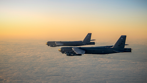 Two B-52H Stratofortress aircraft assigned to the 96th Bomb Squadron fly in formation during Bomber Task Force Europe 20-1 over the Baltic Sea, Oct. 23, 2019. (U.S. Air Force photo by Airman 1st Class Duncan C. Bevan)