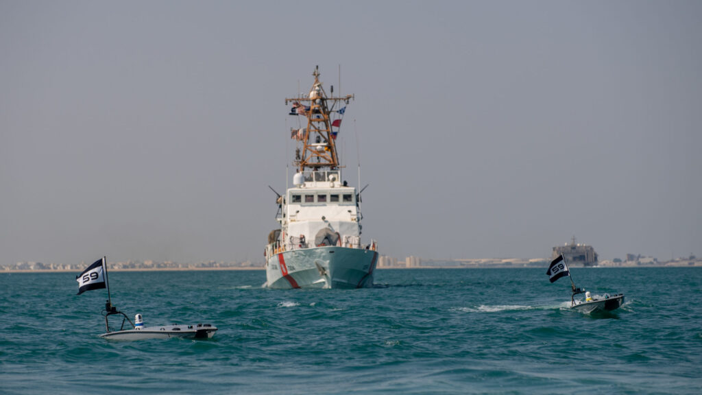 “During the two-day training exercise, Task Force 59 integrated and evaluated new MANTAS T-12 unmanned surface vessels (USV) that operated alongside manned U.S. patrol craft and Bahrain Defense Force maritime assets,” according to a Navy statement.