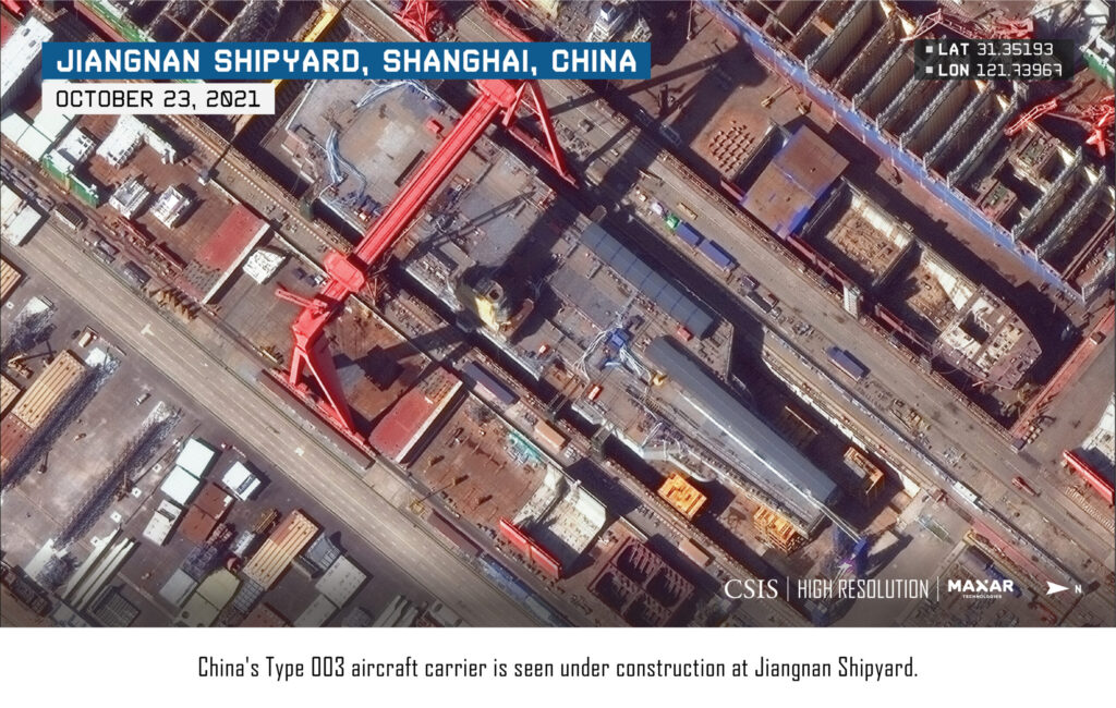 The unnamed Chinese carrier was photographed from space in September and October, according to CSIS. In addition to work on the carrier, the Maxar shots show that “work on other military vessels at Jiangnan appears to have slowed as the shipyard works to fill commercial orders.”