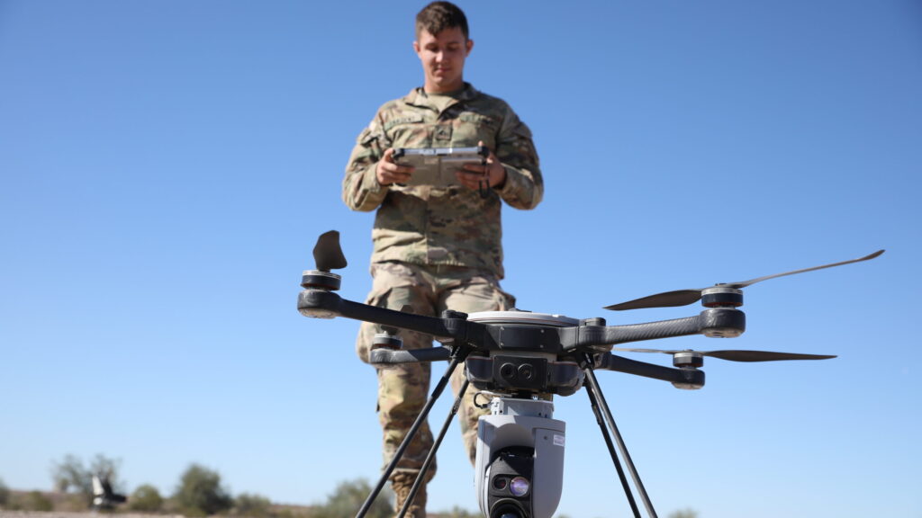 YUMA PROVING GROUND, Ariz: Soldiers are packed into a UH-60 Black Hawk flying to their objective. A small drone carrying ISR sensors launches off the side of the helicopter, buzzing off to scout ahead. The drone streams back a live video feed to the pilots and alerts them to an enemy threat on the ground.