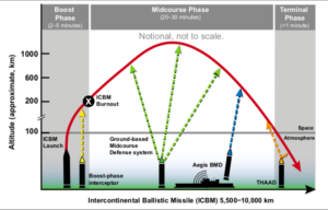 It considered the capabilities of the US Ground-based Midcourse Defense (GMD) system; the planned Next Generation Interceptor (NGI); the Navy’s ship-based Aegis system originally designed to intercept short-, medium-, and intermediate-range ballistic missiles that is now being considered for midcourse-intercept of ICBMs; the Army’s Terminal High Altitude Area Defense (THAAD) system; and potential boost-phase systems using either hit-to-kill or directed energy. The study found issues with each.