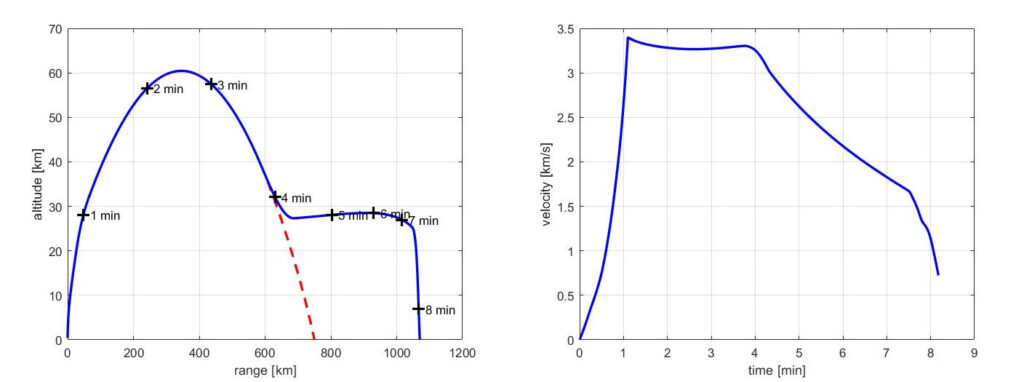 These maneuvers increase aerodynamic drag and, since it is an unpowered glider, this decreases the velocity. These effects are all included in the simulation. Lift and drag coefficients, as a function of the angle of attack, the Mach-number and the altitude, were estimated using an aero-prediction code, based on the shape of the vehicle.