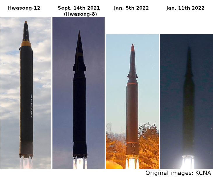 This isn’t the first time the DPRK has claimed to launch a hypersonic weapon; in Sept. 2021, a missile dubbed the Hwasong-8 was launched, but statements in South Korean media suggest that flight failed. Based on images of the January launches, the new missiles are of a different design. Both types have a rocket booster, apparently powered by the engine cluster used for North Korea’s Hwasong-12 and Hwasong-14 ballistic missiles, and at a first glance these look very similar. However, the small Vernier engines used for steering are positioned closer to the main nozzle on the new missile than on the Hwasong-8.