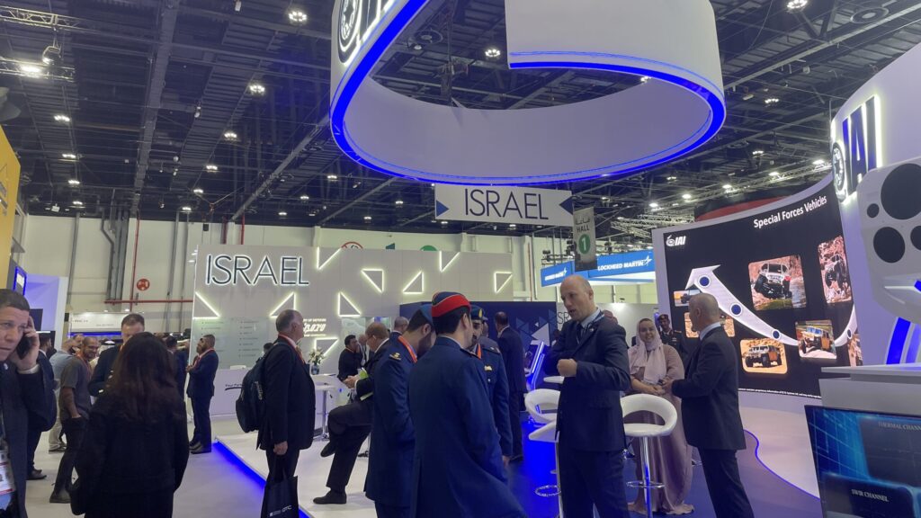 Within Israel’s pavilion, UAE officials wandered through Israel’s Ministry Defense stand, which also houses 15 smaller defense entities. Larger firms like Rafael, Israel Aerospace Industries and Elbit also have their own respective displays, welcoming frequent stops from regional officials to discuss topics like air defense capabilities.