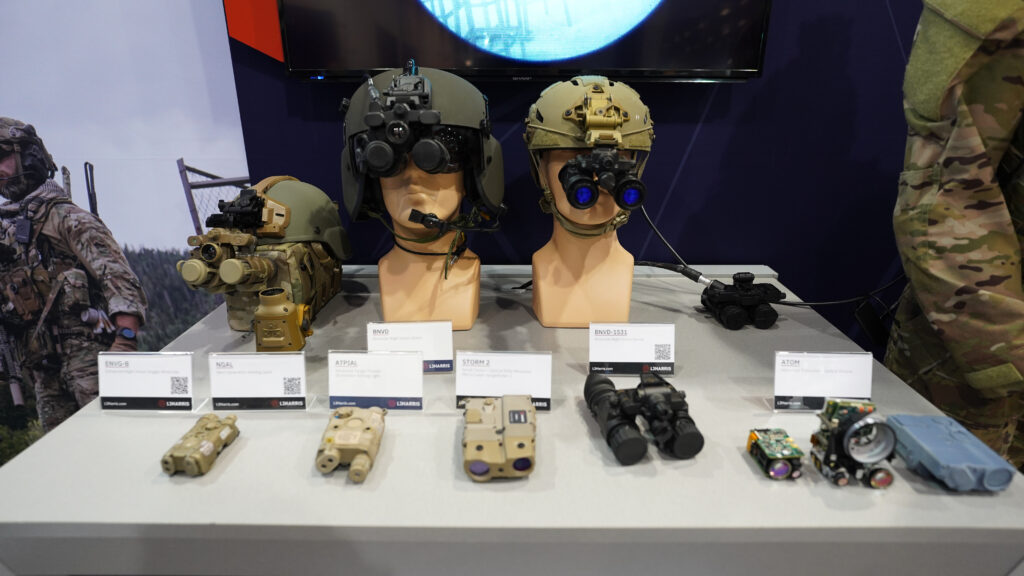 An array of various night vision goggles was on display at the L3HARRIS booth. Models such as their ENVG-B are advertised by the company as also offering Augmented Reality capabilities. (Brendon Smith / Breaking Defense)
