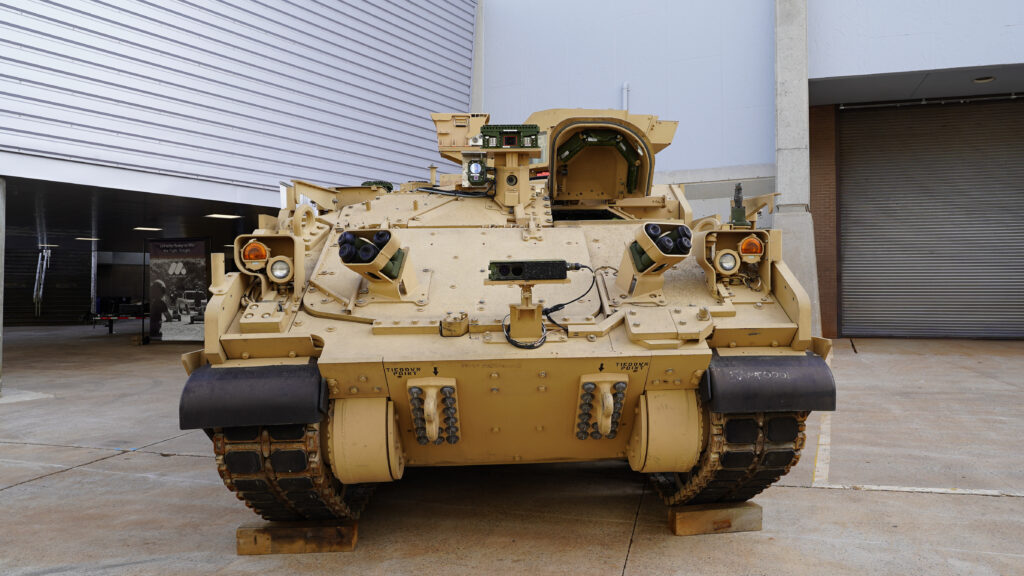 Part of the outdoor exhibit area at AUSA Global, Elbit Systems showed off two of their air defense systems on a tank. The Sling Mobile Mortar System and The MATR-X Multi-Mission Tactical Surveillance Radar. Elbit claims the MATR-X system “can simultaneously scan, identify, track and target thousands of low-altitude airborne targets including small drones, low flying manned aircraft, cruise missiles and other munitions.” (Brendon Smith / Breaking Defense)