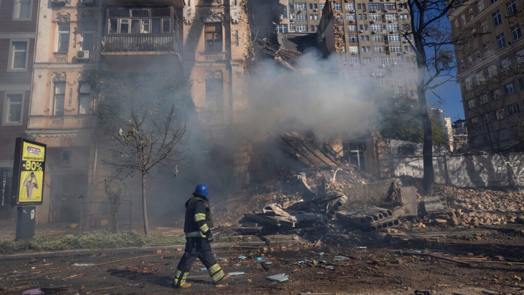 Firefighters respond to a drone attack on Kyiv in October, 2022. (Photo by Paula Bronstein /Getty Images)