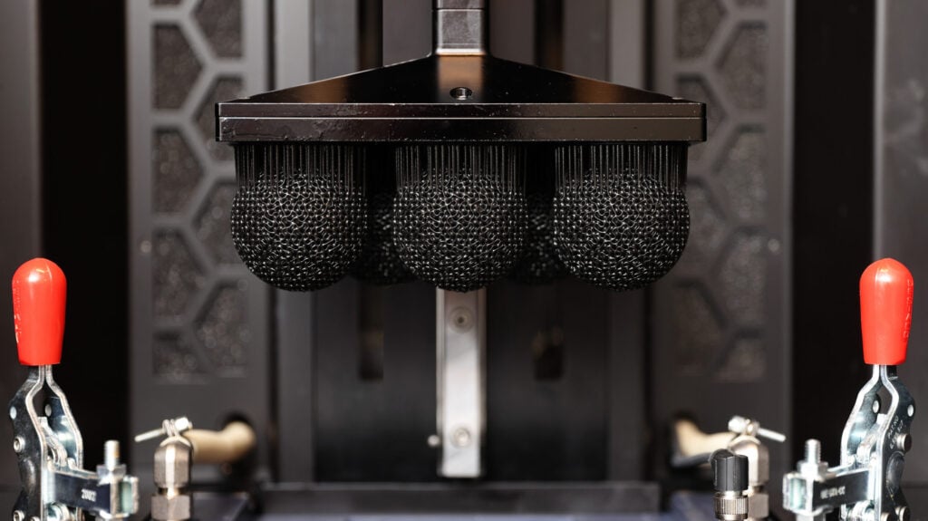 “No one’s been able to make that work,” he said — until Martin and his team figured out how to keep the liquified composite flowing with a (proprietary) combination of heat, stirring, and shaking, as well as mixing in metallic fibers for extra strength and aligning them with magnetic fields. This process allows them to extrude a wide variety of complex shapes that are both lightweight and strong, Ganti boasted, from antennas to the alien-looking black, pitted spheres known as Luneburg lenses, used in everything from radars to lasers.