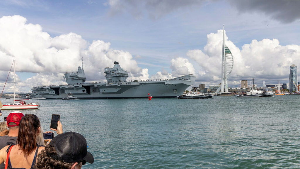 Onlookers take photos of UK aircraft carrier HMS Prince of Wales as it leaves Portsmouth, England, for an autumn deployment (UK MoD)