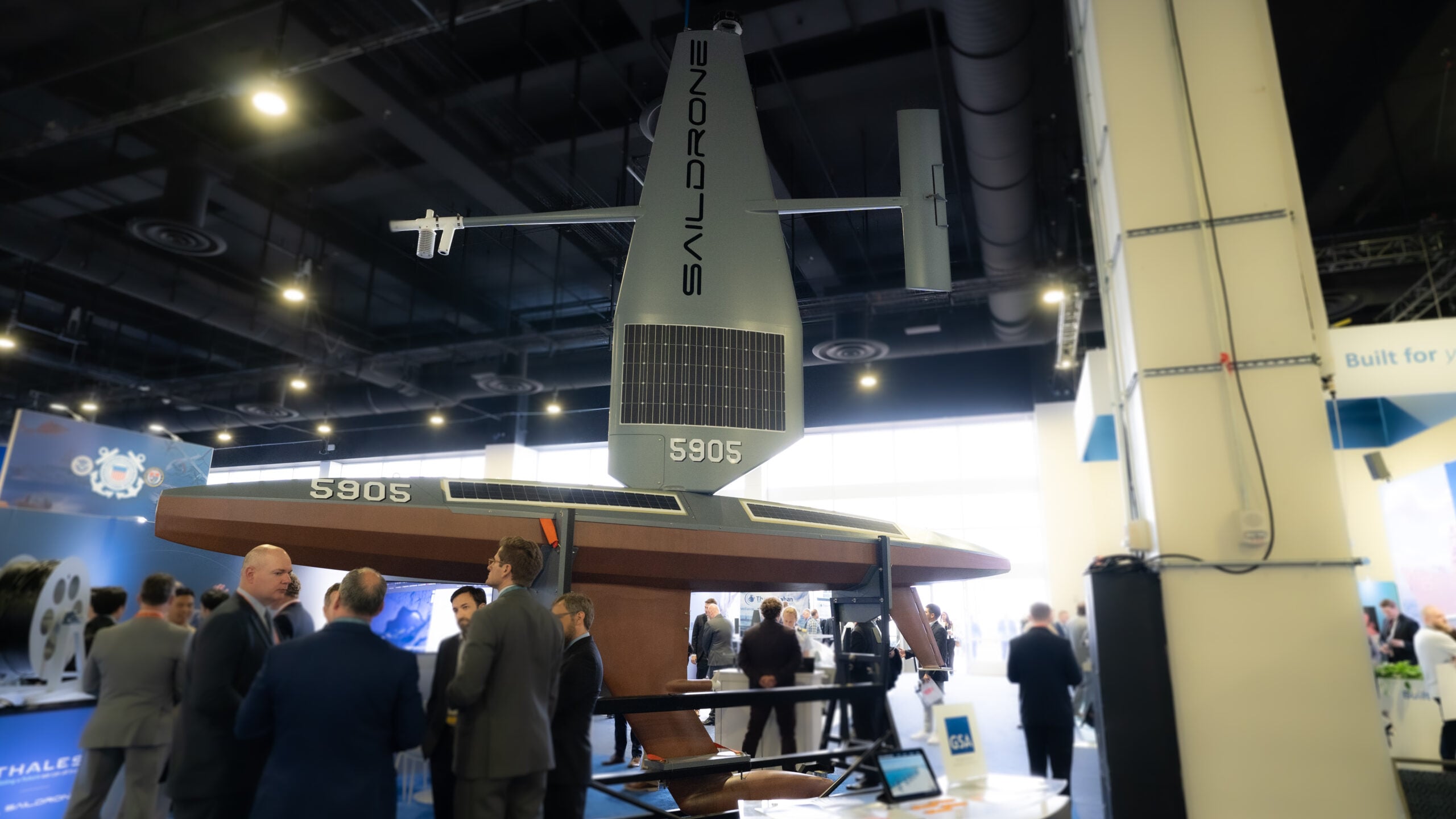 Surface drone maker Saildrone brought a model of its 5904 long range autonomous MDA/ISR solution. The company has seen its systems active in the waters of the Gulf in recent years. (Brendon Smith / Breaking Defense)