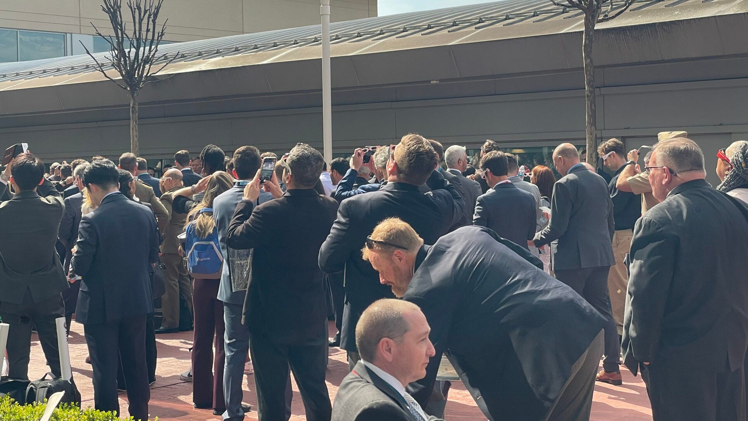 Attendees taking a break from the showroom floor to witness the solar eclipse Monday. (Brendon Smith / Breaking Defense)