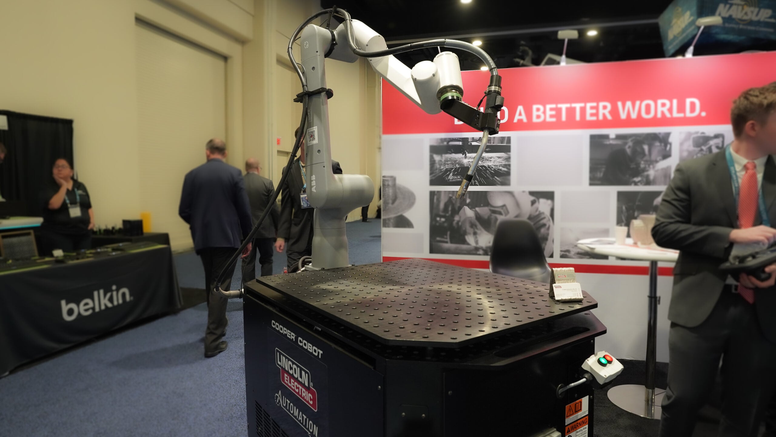 Lincoln electrics Cooper Cobot is meant to increase welding efficiency and accuracy. Acting as a productivity enhancing collaborator for its human counterparts. (Brendon Smith / Breaking Defense)