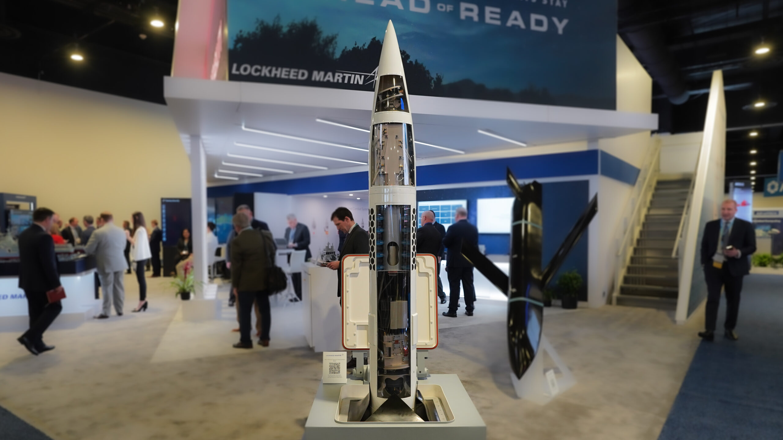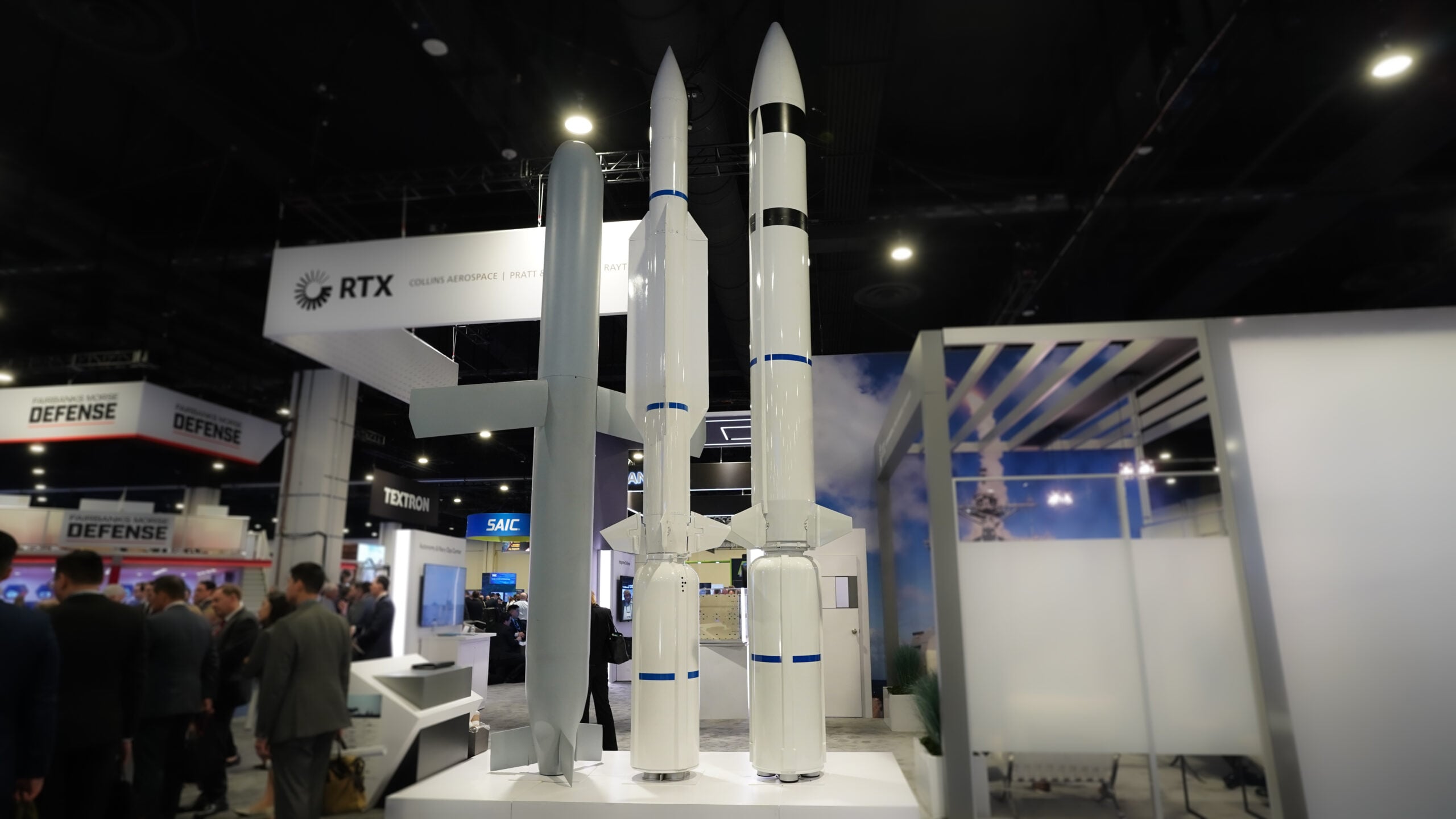 At the Raytheon booth, their new missle offerings could be seen from across the show floor. Up close it was hard to take in the enormity. Raytheon says these missiles, both. long and short range, will prove critical. (Brendon Smith / Breaking Defense)