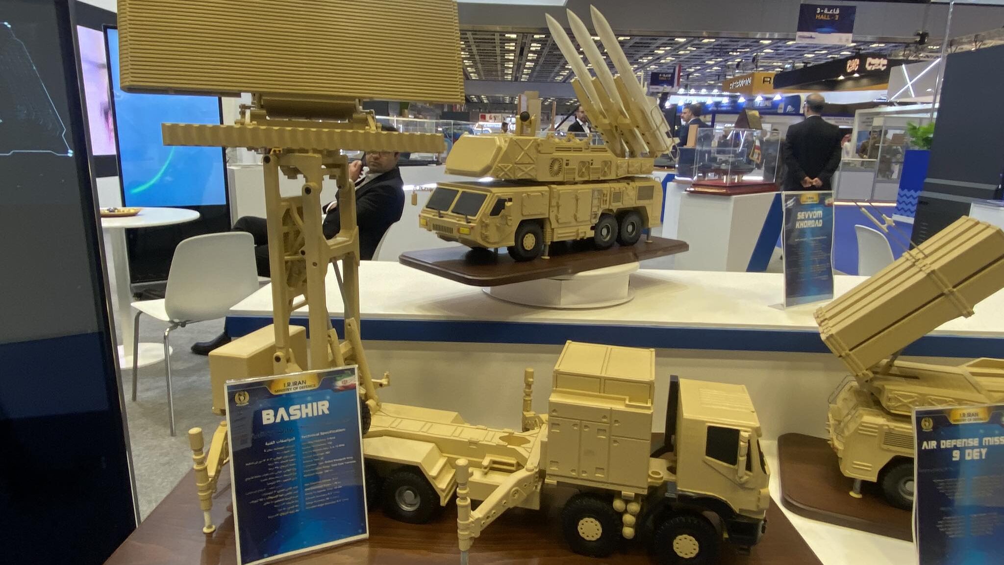 At the show Iran also displayed a model of its Sevvom Khrodad or Third of Khordad medium-range air defense system, bragging that it was the system that downed an American MQ-4C Triton in 2019. Sevvom Khordad is described by its producer as a “phased array radar, medium height, mobile surface-to-air missile” and is designed “to detect, track and destroy jammers with Taer 2 missiles during electronic warfare.” Its anti-cruise missile, dubbed 9 Dey, has a target attacking range of 20 kilometers and effective altitude of 10 kilometers.