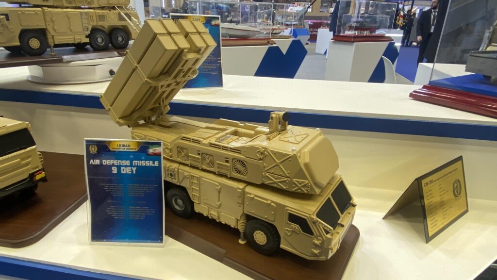 At the show Iran also displayed a model of its Sevvom Khrodad or Third of Khordad medium-range air defense system, bragging that it was the system that downed an American MQ-4C Triton in 2019. Sevvom Khordad is described by its producer as a “phased array radar, medium height, mobile surface-to-air missile” and is designed “to detect, track and destroy jammers with Taer 2 missiles during electronic warfare.” Its anti-cruise missile, dubbed 9 Dey, has a target attacking range of 20 kilometers and effective altitude of 10 kilometers.