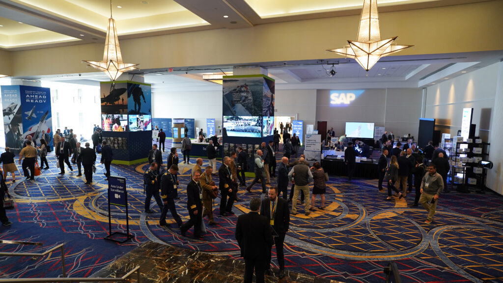 Attendees gathered on the showroom floor for a packed NavAir leadership panel. (Brendon Smith / Breaking Defense)