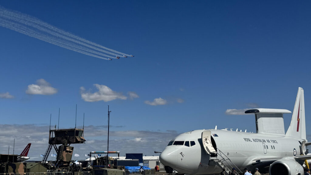 Royal Australian Air Force Roulettes perform at the Avalon air show, with a RAAF E-7 Wedgetail in the foreground. (Michael Marrow/Breaking Defense)