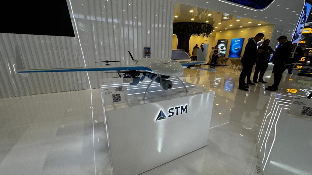 STM also debuted a fixed-wing unmanned aerial vehicle UAV, with scale 1:2 model at its stand at the show. The model suggested the actual drone could be equipped with electro-optical pod for performing Intelligence, Surveillance and Reconnaissance (ISR) missions and is capable of carrying two munitions or a smaller person view (FPV) drone.
