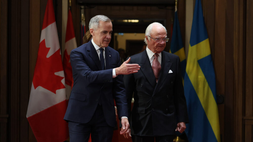 Mark Carney, Canada's prime minister, left, and King Carl XVI Gustaf of Sweden during a welcome ceremony on Parliament Hill in Ottawa, Ontario, Canada, on Tuesday, Nov. 18, 2025. (Photographer: David Kawai/Bloomberg via Getty Images)