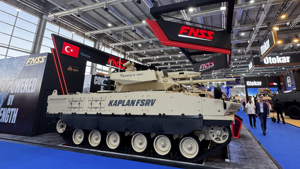 A look at a concept design for the much-hyped Future Combat Air System sixth-gen fighter jet under development by France, Germany and Spain. (Agnes Helou / Breaking Defense)Turkish defense firm FNSS rolled its Kaplan FSRV tracked vehicle into the World Defense Show outside Riyadh on Feb. 8, 2026. (Agnes Helou / Breaking Defense)Russia’s Rosoboronexport put several defense systems on display at World Defense Show 2026, including this unmanned aerial vehicle dubbed Supercam S350, seen on Feb. 8, 2026. (Agnes Helou / Breaking Defense)