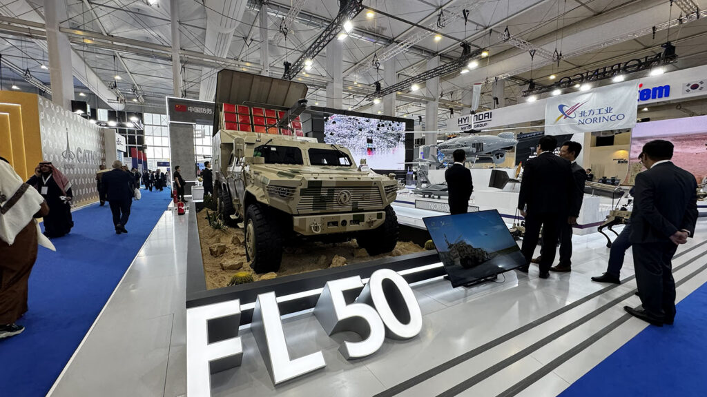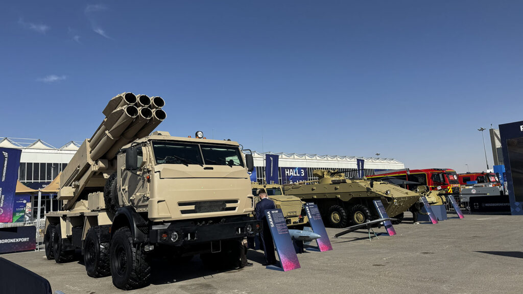 Chinese defense firm Norinco displays its FL 50 armored vehicle at World Defense Show 2026 outside Riyadh on Feb. 8, 2026. (Agnes Helou / Breaking Defense)French multi-national shipbuilder CMN Naval says that this boat, the DV 10, can hit 90 knots, or more than 100 miles per hour. The boat sits on display the World Defense Show in Saudi Arabia on Feb. 8, 2026. (Agnes Helou / Breaking Defense)Among the Russian systems on display at World Defense Show 2026 is the Sarma, a mobile launcher made by Rostec and exported by Rosoboronexport. (Agnes Helou / Breaking Defense)