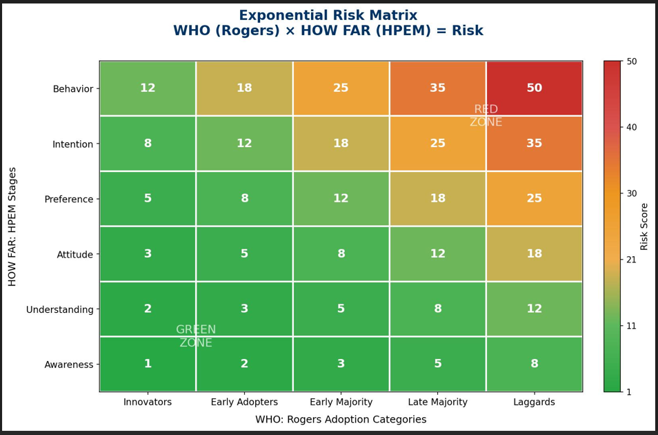 The Exponential Risk Matrix captures how risk compounds across four dimensions simultaneously. The WHO dimension (Diffusion Risk) reflects that moving from Innovators toward Laggards increases visibility and backlash potential. The HOW FAR dimension (Behavioral Distance) reflects a person or population’s Hierarchy of Psychological Effects Model (HPEM) position; best practice involves shifting HPEM one step per cycle. The TOLERANCE dimension (Social Judgment) reflects where the message lands relative to the audience’s latitude of acceptance; messages that fall inside the latitude of rejection do not persuade, they harden opposition. The CAPABILITY dimension reflects that some audiences cannot do what is being asked, even if they agree — a constraint that should never be overlooked in influence planning.