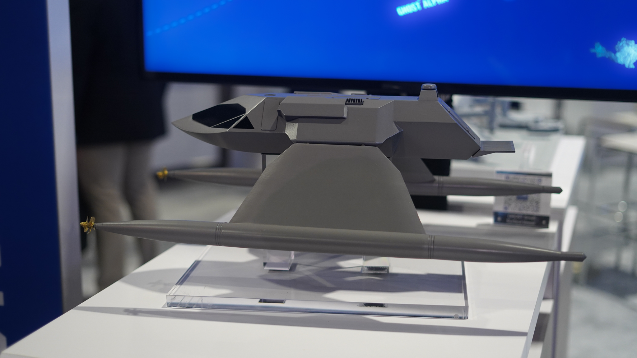 Shield AI shows off its V Bat vertical-takeoff unmanned system at Sea Air Space 2025. (Brendon Smith / Breaking Defense)